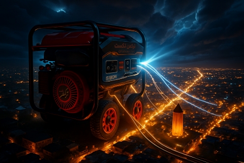 فتومونتاژ قطعی برق و یک موتور برق غول در کنار برج قابوس گنبدکاووس